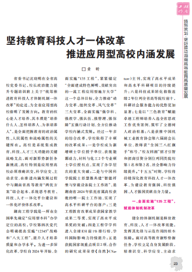 此文是《湖南工作》(2025年10月刊)推介应用型高校教育科技人才综合改革成功经验,更好推动湖南高等教育高质量发展的文章,也是对学校“135工程”实施以来取得成绩的全面总结。文章3600余字,从全面实施“135工程”,赋能体制机制改革;深入落实“两优”方案,优化学科专业布局;量质并举引才育才,人才引育创新强校新模式;融合科技产业创新,科技成果服务产业需求等四个方面,全面介绍了我校紧紧锚定“全面建成特色鲜明、贡献突出的一流工程应用型地方大学”总体目标,在推进内涵发展过程中持续深化教育科技人才一体改革的工作实践。