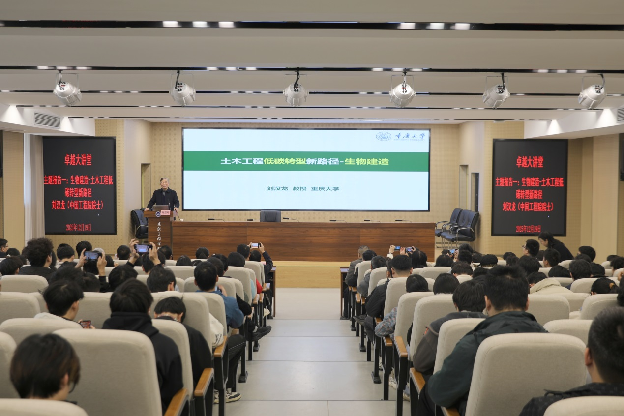 刘汉龙院士作题为《生物建造—土木工程低碳转型新路径》的学术讲座。他指出,在全球应对气候变化与生态环境保护的背景下,推动工程建造向绿色、低碳、可持续方向转型,已成为落实“双碳”战略目标和促进行业技术升级的关键路径。刘汉龙紧扣全球气候变化与国家“双碳”战略,阐述了符合双碳战略的人与自然和谐共生的生物建造概念,剖析了生物建造的内涵、初步构建了生物建造体系;他围绕微生物建造、植物建造、动物建造及仿生建造四个类别,从生物建造理论、技术、材料、装备和工程案例等方面展开介绍,并对该学科方向的未来发展趋势与面临挑战进行了前瞻性展望。
