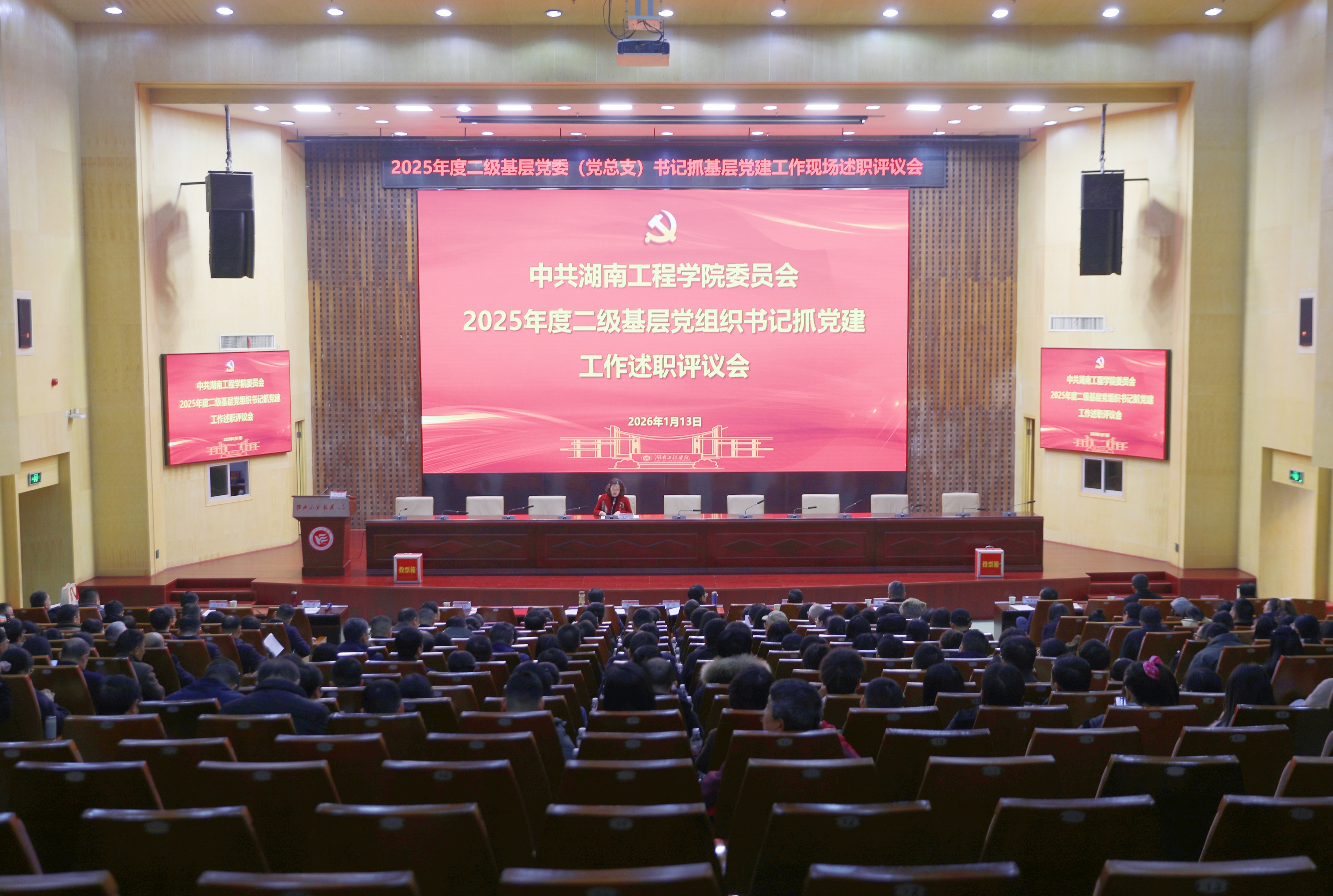 1月13日,学校在一报告厅举行2025年度二级基层党委(党总支)书记抓基层党建工作述职评议会。党委书记黄昕,党委副书记、校长易兵等全体校领导出席会议,二级基层党委(党总支)书记、委员,专职组织员和相关职能部门负责人等200余人参加会议。会议由党委副书记向前主持。