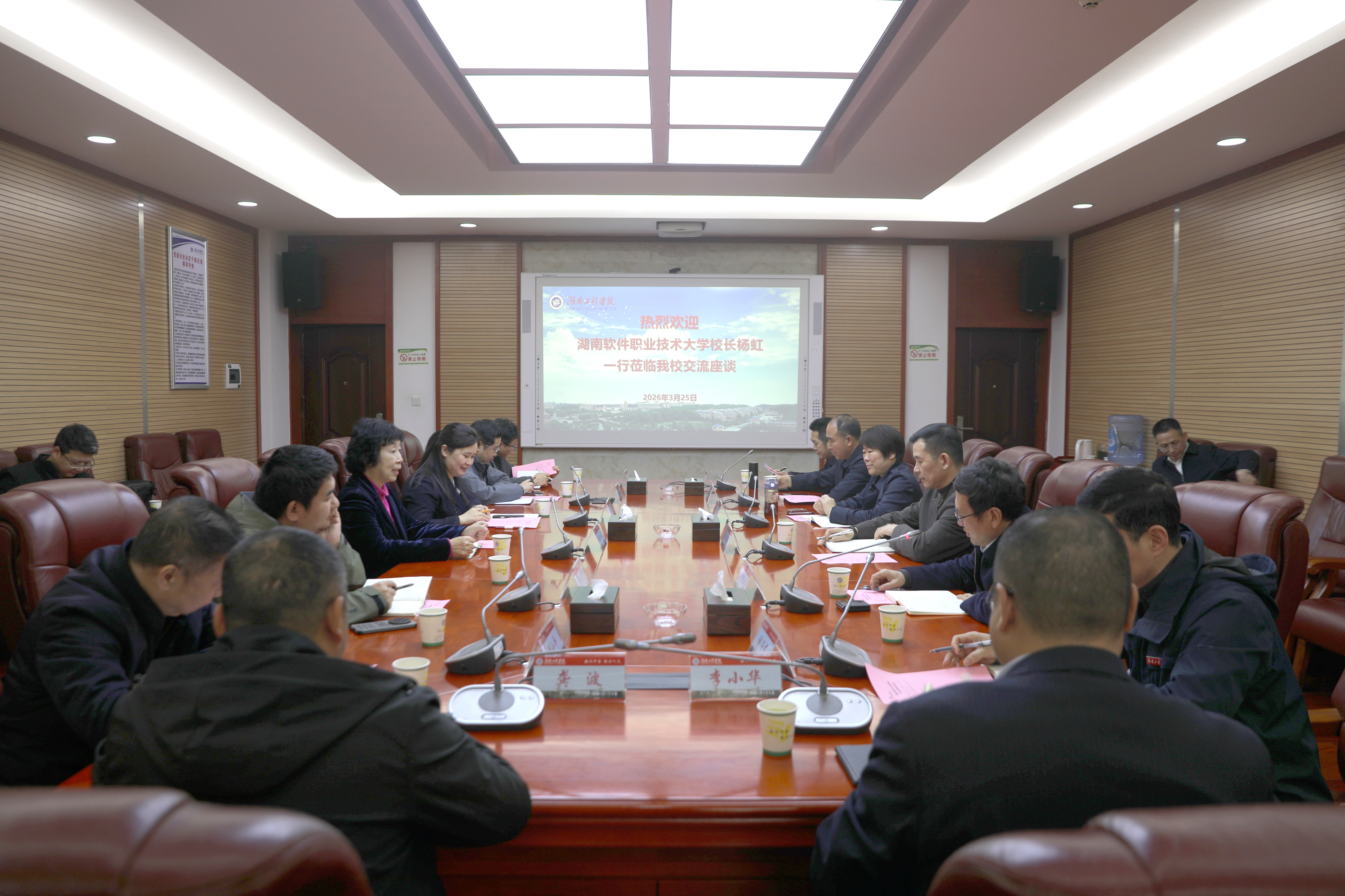 3月25日上午,湖南软件职业技术大学校长杨虹,党委书记、政府督导专员覃波带队赴我校开展交流座谈与实地考察。我校党委书记曹执令,党委委员、副校长罗毅平在电气楼一会议室接待来宾。座谈会由罗毅平主持。