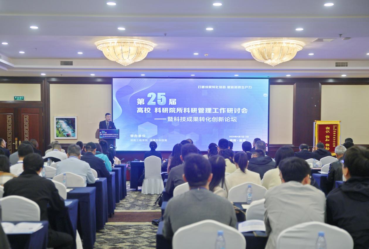 4月1日至3日, 我校联合湘潭市科技局举办第25届高校、科研院所科研管理工作研讨会暨科技成果转化创新论坛。本次论坛以“打通成果转化链路,赋能新质生产力”为主题,汇聚了来自高校、科研院所、地方科技管理部门及企业的科研管理人员,共同探讨科技成果转化的新路径、新机制。