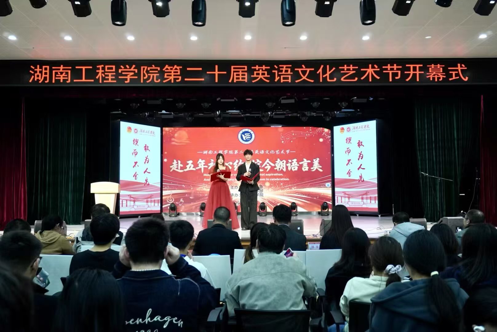 4月21日晚,我校第二十届英语文化艺术节开幕式在学生活动中心举行。党委宣传部、团委、各教学院相关负责人,外国语学院全体院领导、辅导员、班主任代表及各学院学生代表共400余人参加活动。