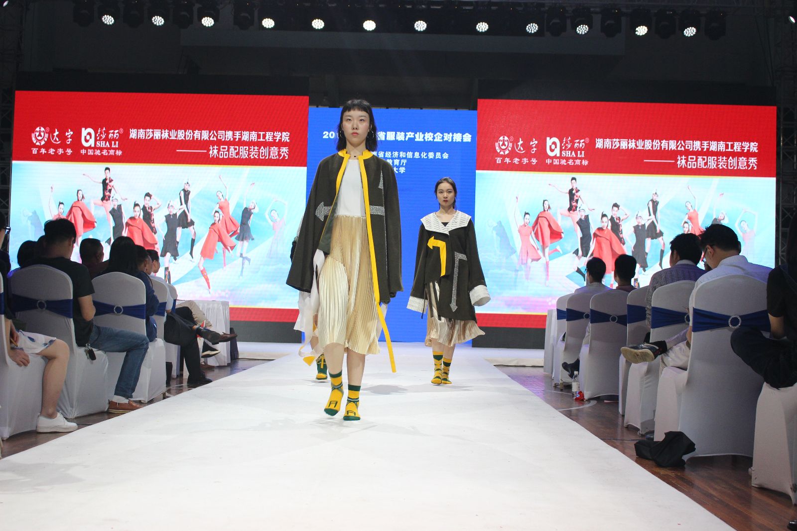 对接会上还集中展出了湖南工程学院与湖南莎丽袜业公司等4组校企合作成果,由我校服装设计与表演专业的学生动态展示了我校与湖南丽莎袜业联合研究的配饰袜品设计、湖南旭荣制衣有限公司合作推出的学院风运动服系列设计作品,引起与会代表的关注和高度肯定。我校服装设计专业自创办以来,一直以培养具有创新精神的高素质服装行业应用型人才为重任,秉承立足湖南服饰文化,服务区域经济建设,积极探索产教融合新模式。此次对接会的召开将进一步推进产业集聚发展、深化产学研合作、实现产教双赢,有效促进服装设计专业教育的改革和发展。