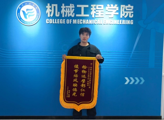 近日,机械工程学院学生工作办公室先后收到两面锦旗与一封感谢信,对机械电子工程专业22级学生何俊炀的拾金不昧行为表达诚挚谢意,并对学校立德树人的扎实成效表示赞扬。