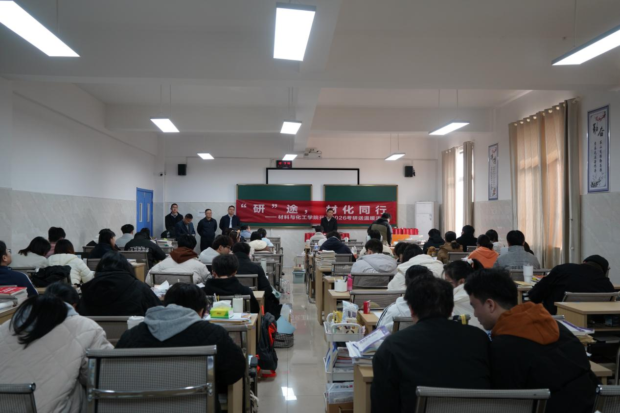 12月8日上午,材料与化工学院在材化楼考研自习室607、609开展主题为“光聚研途,材化同行”2026考研送温暖活动。学院党委书记徐粤宇,院长黄先威,副书记陶连洲,副院长兰东辉、谭建平,学办全体辅导员参加。本次活动由学院爱心社主办。