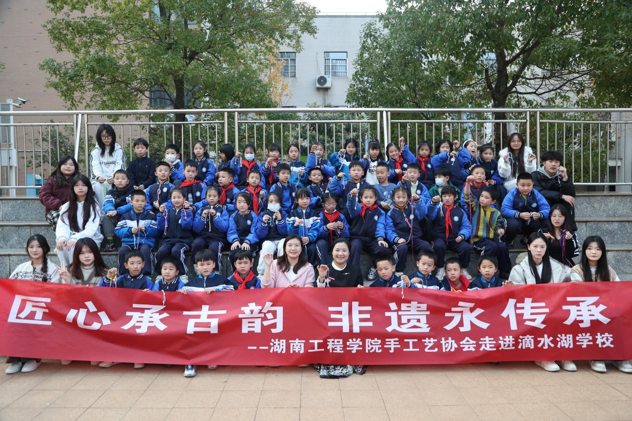 为深化校地文化交流,推动中华优秀传统文化传承,12月10日,我校DIY手工协会及纺织服装学院《服饰手工艺》课程组的师生们走进岳塘区滴水湖学校,开展“大手牵小手”智慧种子系列非遗传承活动。