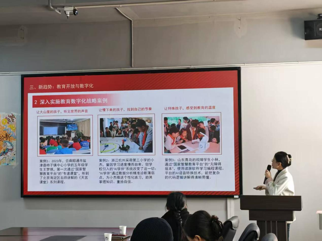 宣讲以“深学笃行党的二十届四中全会精神,奋力谱写教育高质量发展新篇章”为主题。魏丹系统介绍了全会概况并从“新坐标、新内涵:新趋势三个关键词展开了深入浅出的论述。她表示,“办好人民满意的教育”是新时代教育工作的核心任务,需要扎实推进立德树人工程,优化教育资源配置,持续推动基础教育扩优提质和高等教育内涵式发展。宣讲中,她还结合国家智慧教育平台、“AI学伴”等数字化教育应用实例,生动展现了科技如何赋能教育公平与个性化学习,引发了在场师生的广泛共鸣。