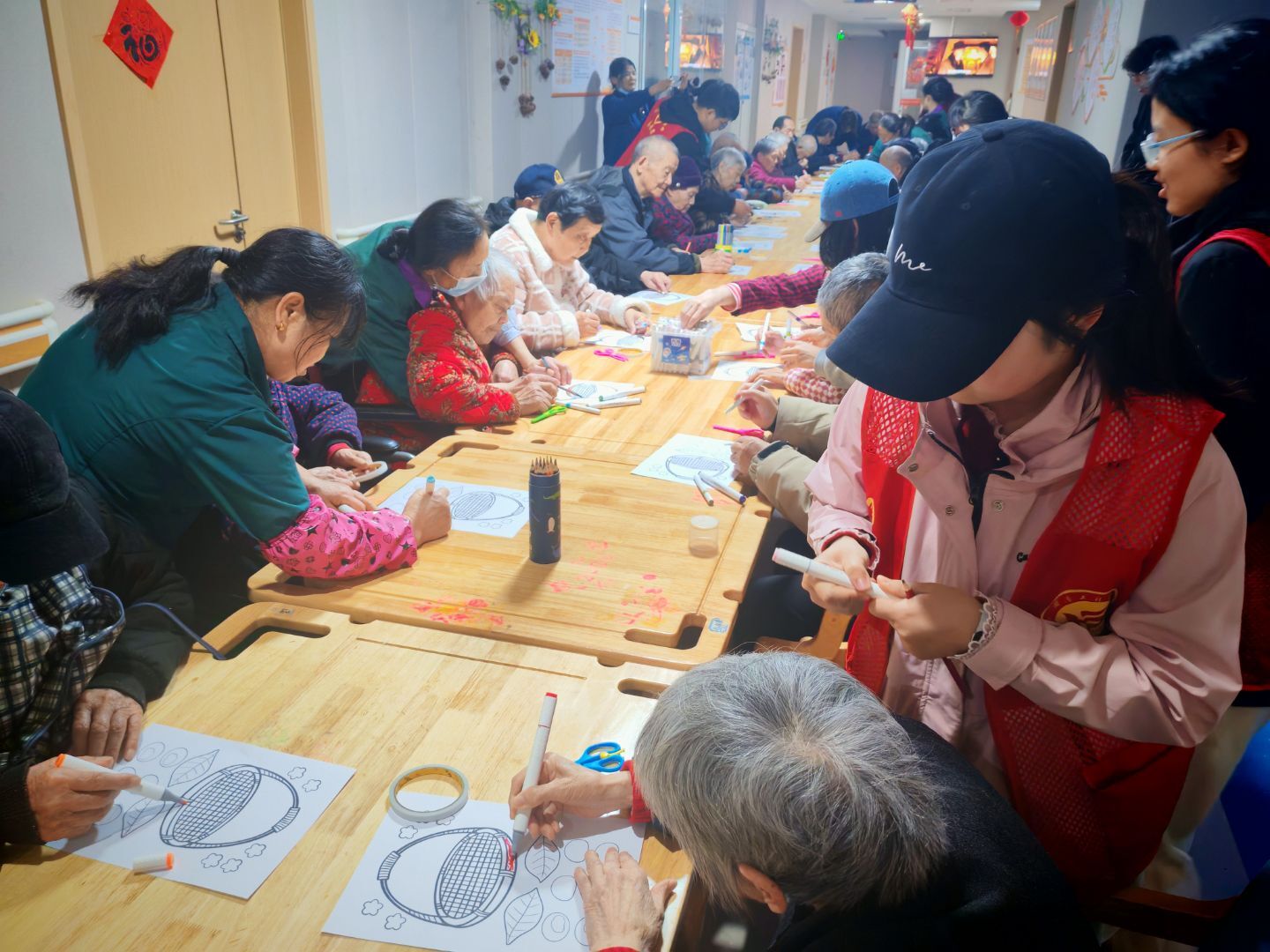 活动伊始,志愿者们协助工作人员将老人们有序带到活动场地,并分发画具。绘画环节中,志愿者耐心陪伴在老人身边,协助调颜料、握笔姿势,轻声讲解绘画技巧,帮助老人们放松心情,充分表达自我。老人们兴致盎然,认真勾勒线条、涂抹色彩,一幅幅充满童趣与生机的画作在纸上慢慢呈现。现场氛围温馨融洽,欢声笑语不断。